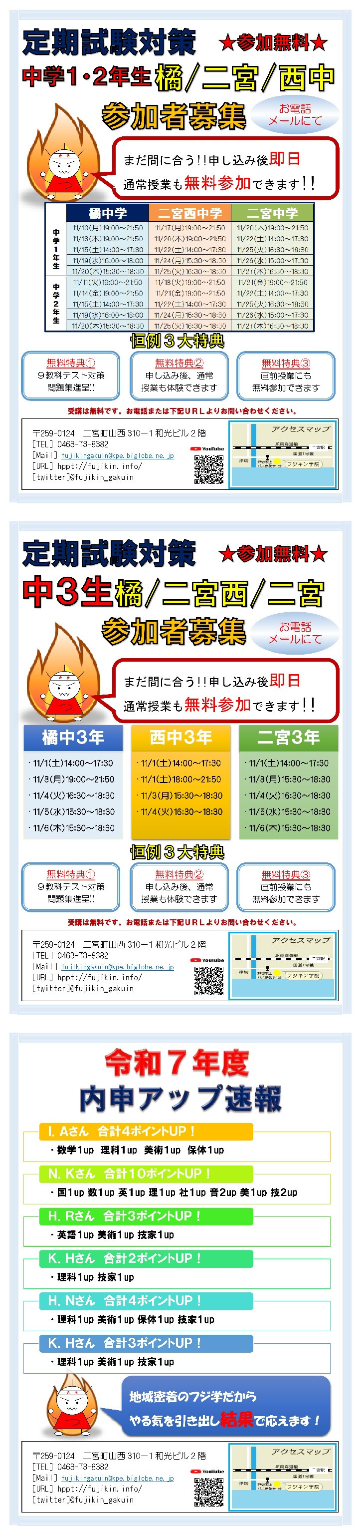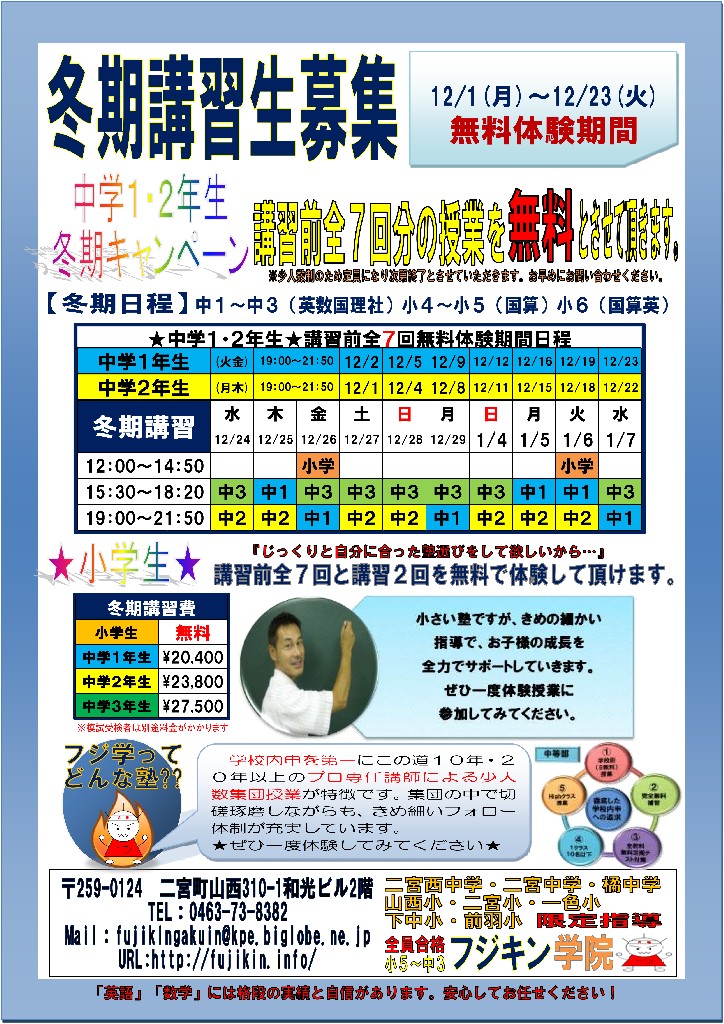 フジキン学院は橘、二宮地域に密着した授業で、子供達の学力を向上させ、成績アップ、志望校全員合格を成し遂げてきました。徹底した学校別、志望校別クラス、過去問による定期試験対策、無料補習、テスト前集中授業… 変わらない良さを残しながら、時代や地域のニーズに合わせて、日々進化していきます。
