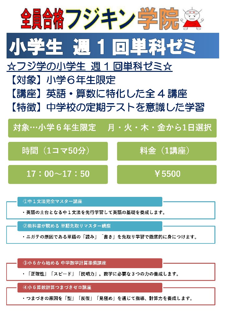 フジキン学院は橘、二宮地域に密着した授業で、子供達の学力を向上させ、成績アップ、志望校全員合格を成し遂げてきました。徹底した学校別、志望校別クラス、過去問による定期試験対策、無料補習、テスト前集中授業… 変わらない良さを残しながら、時代や地域のニーズに合わせて、日々進化していきます。