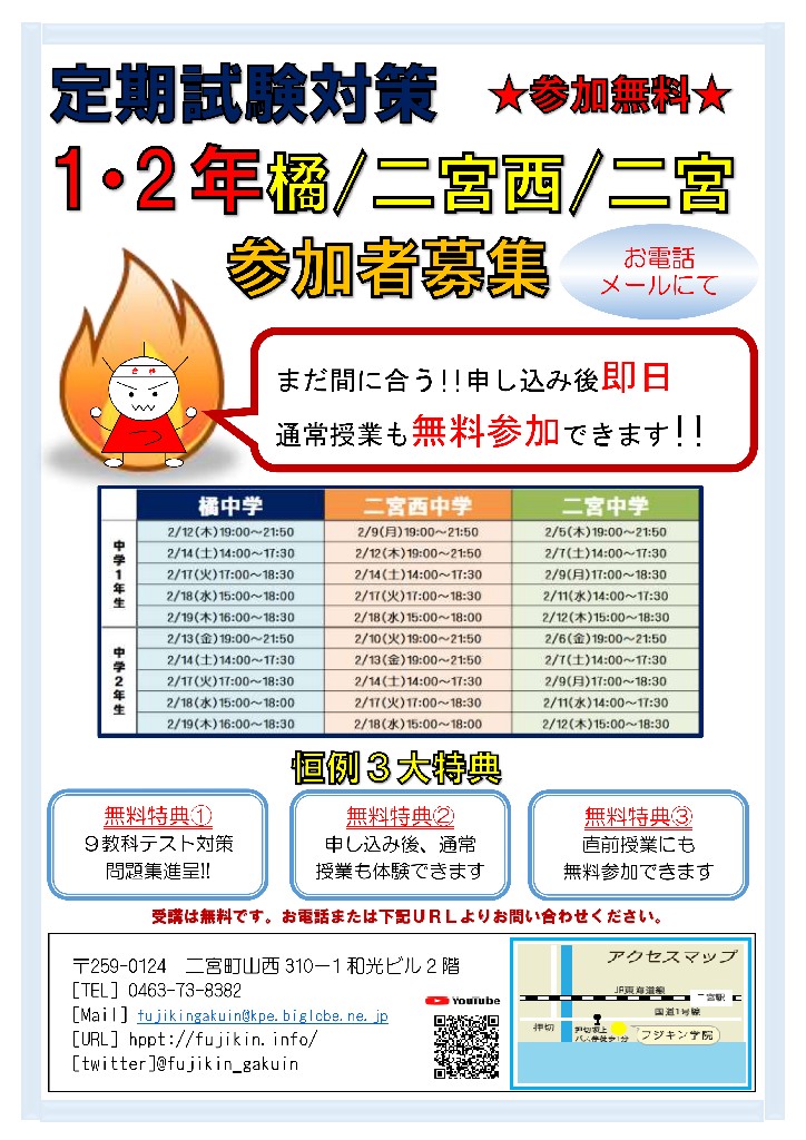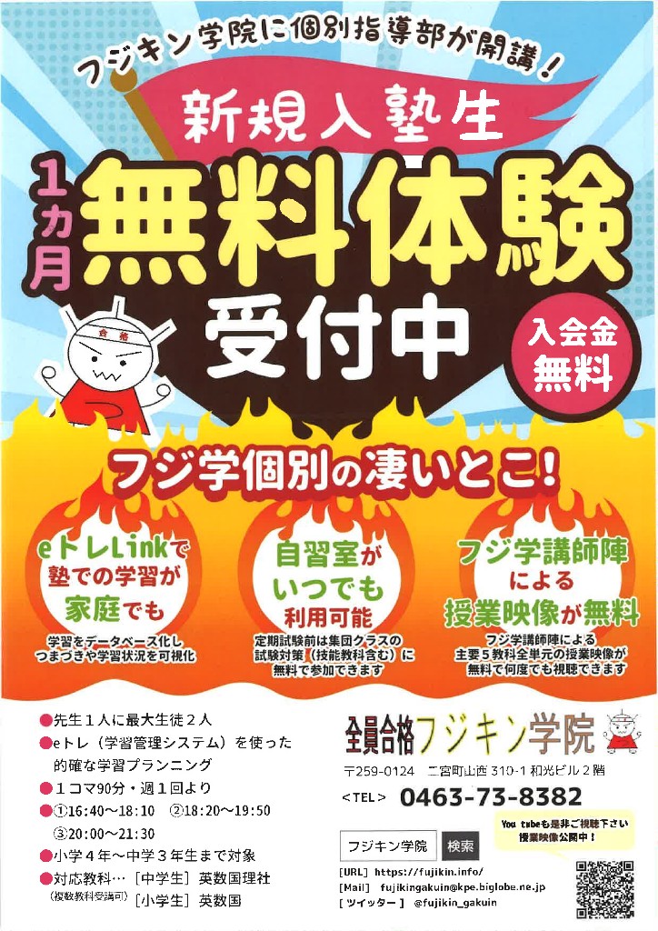 フジキン学院は橘、二宮地域に密着した授業で、子供達の学力を向上させ、成績アップ、志望校全員合格を成し遂げてきました。徹底した学校別、志望校別クラス、過去問による定期試験対策、無料補習、テスト前集中授業… 変わらない良さを残しながら、時代や地域のニーズに合わせて、日々進化していきます。